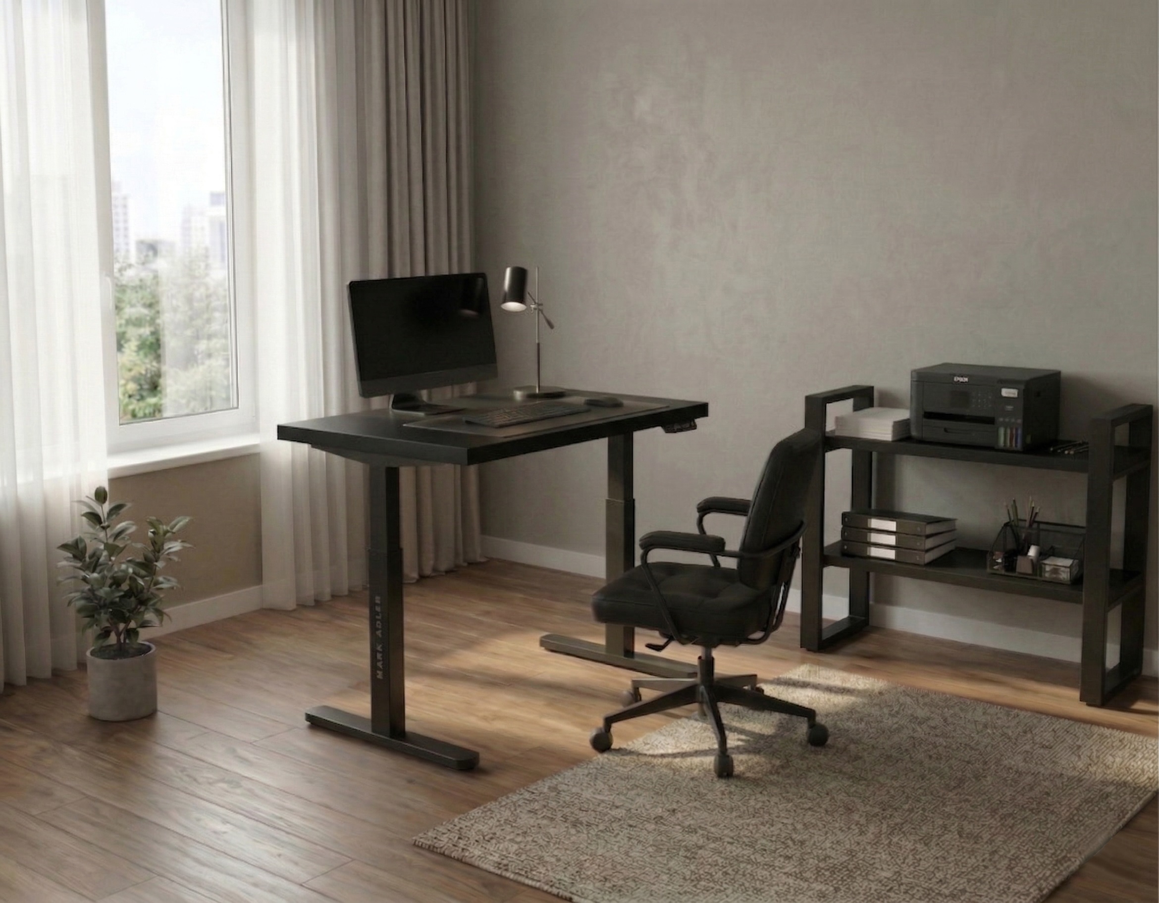 Dzięki regulowanej szerokości stelaża stworzysz przestrzeń, jaką lubisz — rozstaw nóg biurka dopasujesz do swoich potrzeb i warunków mieszkaniowych.