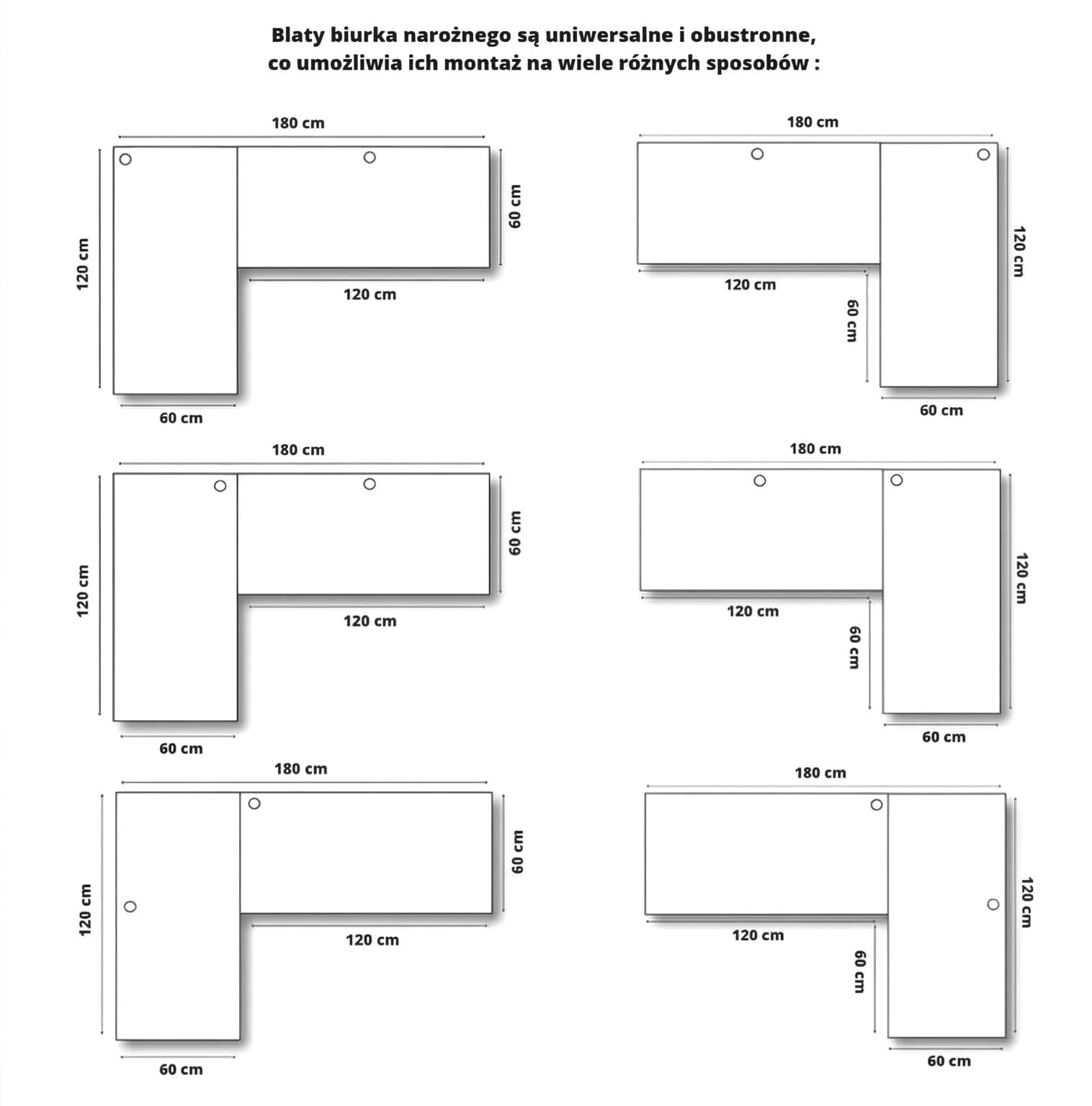 Standardowo w jednym blacie otwór jest pośrodku, a w drugim w kącie.