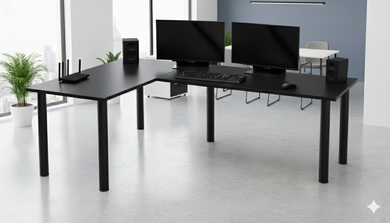 ✅ Łączenie blatów - Blaty w naszym biurku narożnym są solidnie połączone od spodu za pomocą masywnych, niewidocznych płaskowników stalowych. Zapewniają one bardzo mocne i stabilne zespolenie – blat zachowuje sztywność, nie ugina się i wygląda estetycznie z każdej strony. Nie ma powodów do obaw – to trwałe i sprawdzone rozwiązanie.