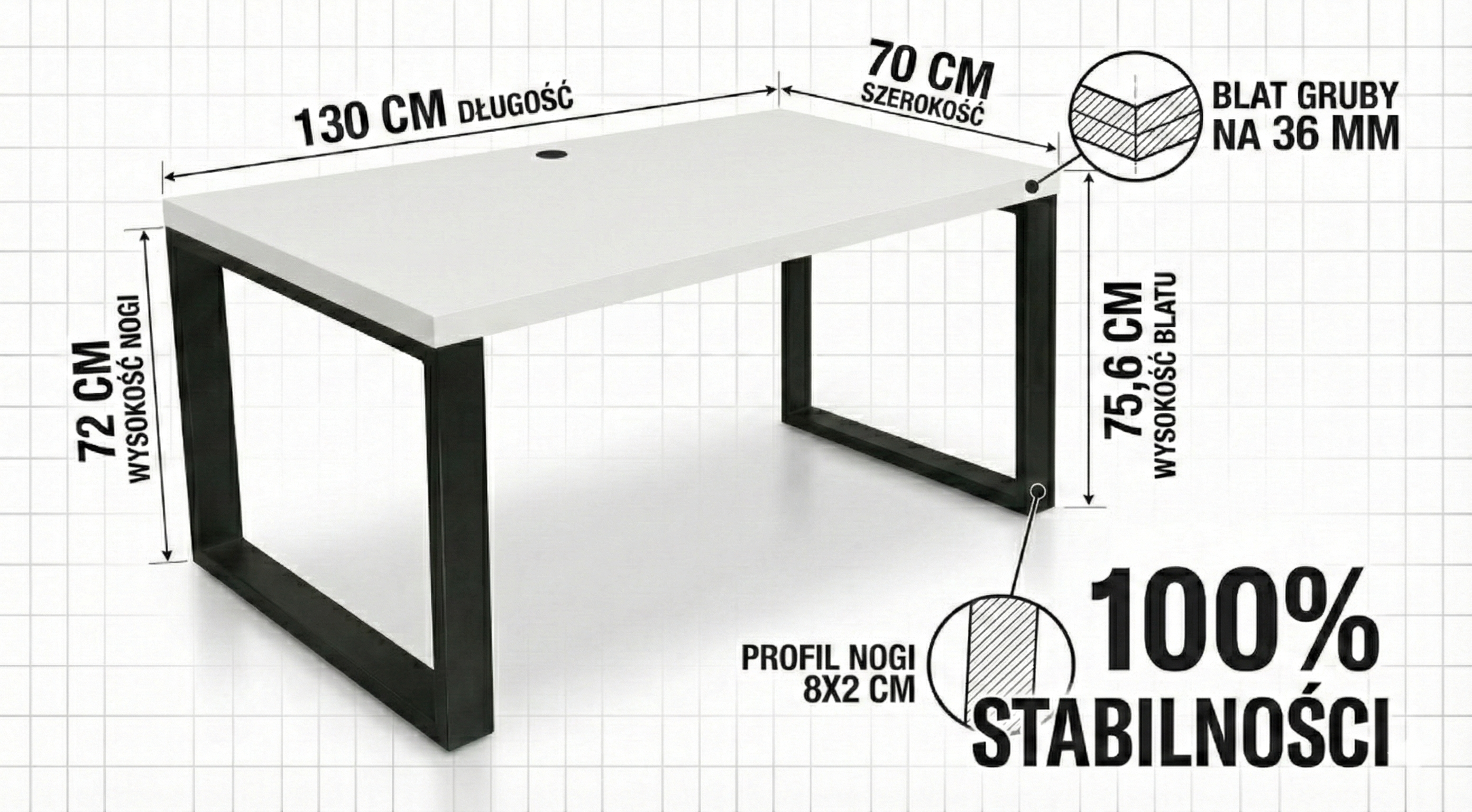 DUŻE BIURKO GAMINGOWE SERIA XL 130X70 Blat pogrubiony 36 mm KOMPUTEROWE DO FIRMY BIURA BIAŁE W STYLU LOFT