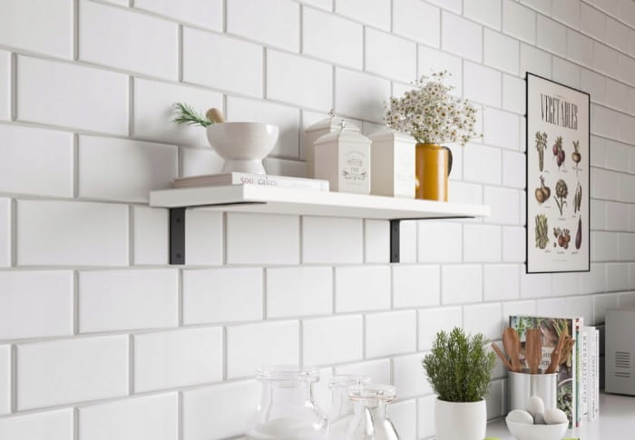 Półki posiadają metalowe, masywne uchwyty w kształcie kontownika, co nie tylko dodaje im solidności, ale również nadaje unikalny, nowoczesny charakter. Zastosowanie metalu doskonale kontrastuje z bielą alpejską, tworząc harmonijną kompozycję.