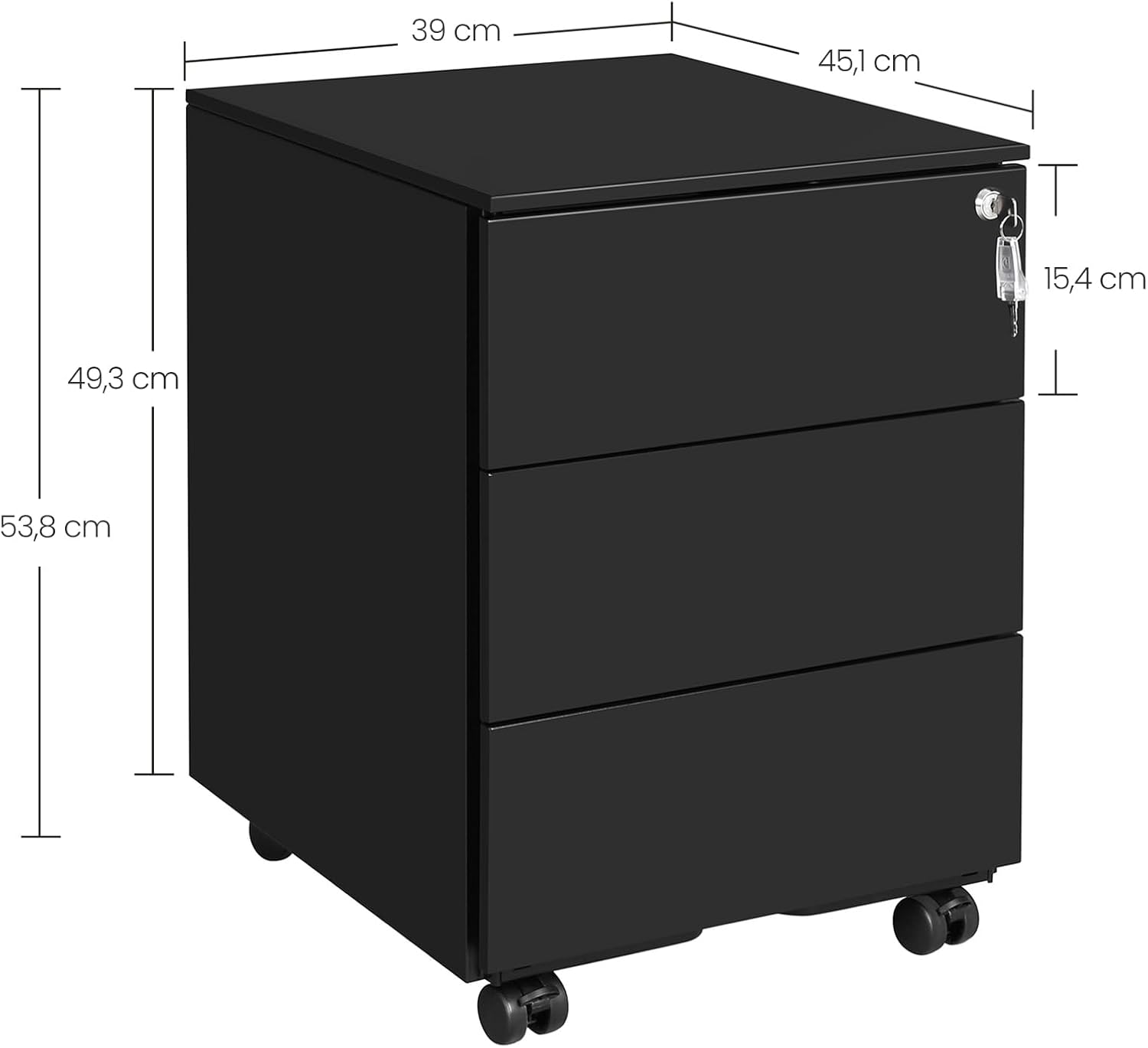 Mobilność szafki zapewniają cztery obrotowe kółka, z których dwa posiadają hamulce.