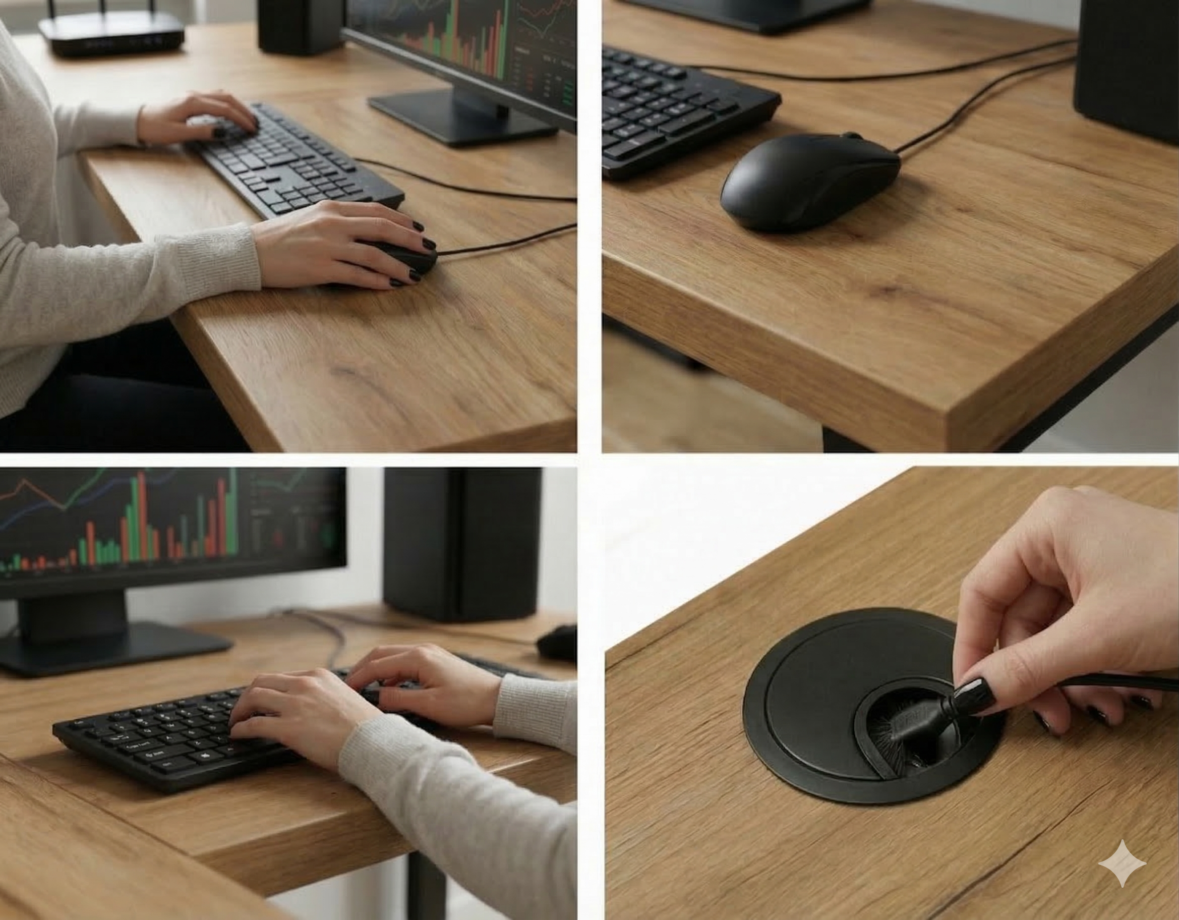 Biurko wyposażone jest w dwa premium metalowe przepusty kablowe ze szczotką – trwałe, eleganckie i znacznie lepsze od tanich plastikowych wersji. Solidny metal podkreśla ekskluzywny charakter biurka, a delikatne włókna nie tylko chronią kable przed kurzem i plątaniem, ale także dodają estetyki. To detale, które wyróżniają biurko i nadają mu nowoczesny, stylowy wygląd.