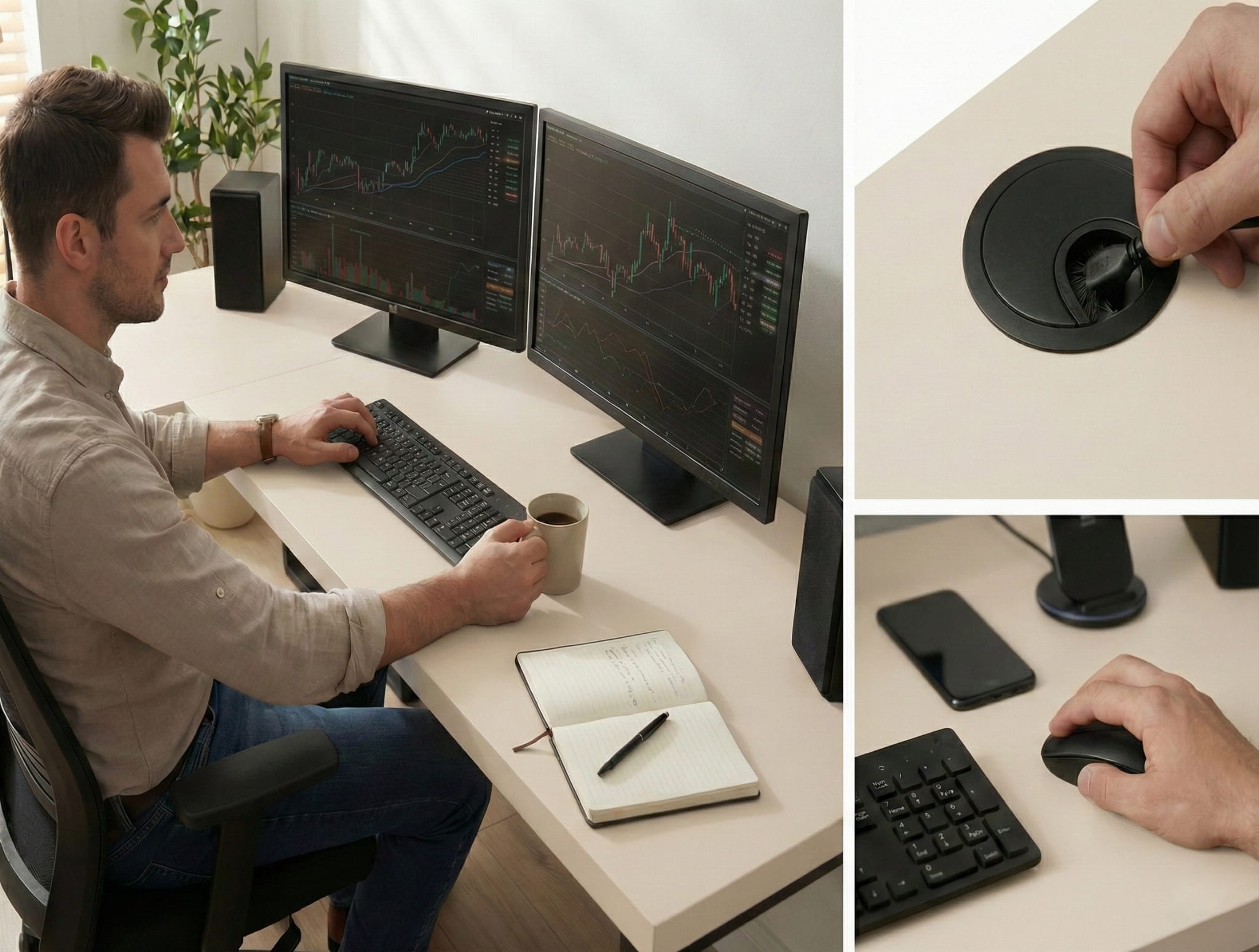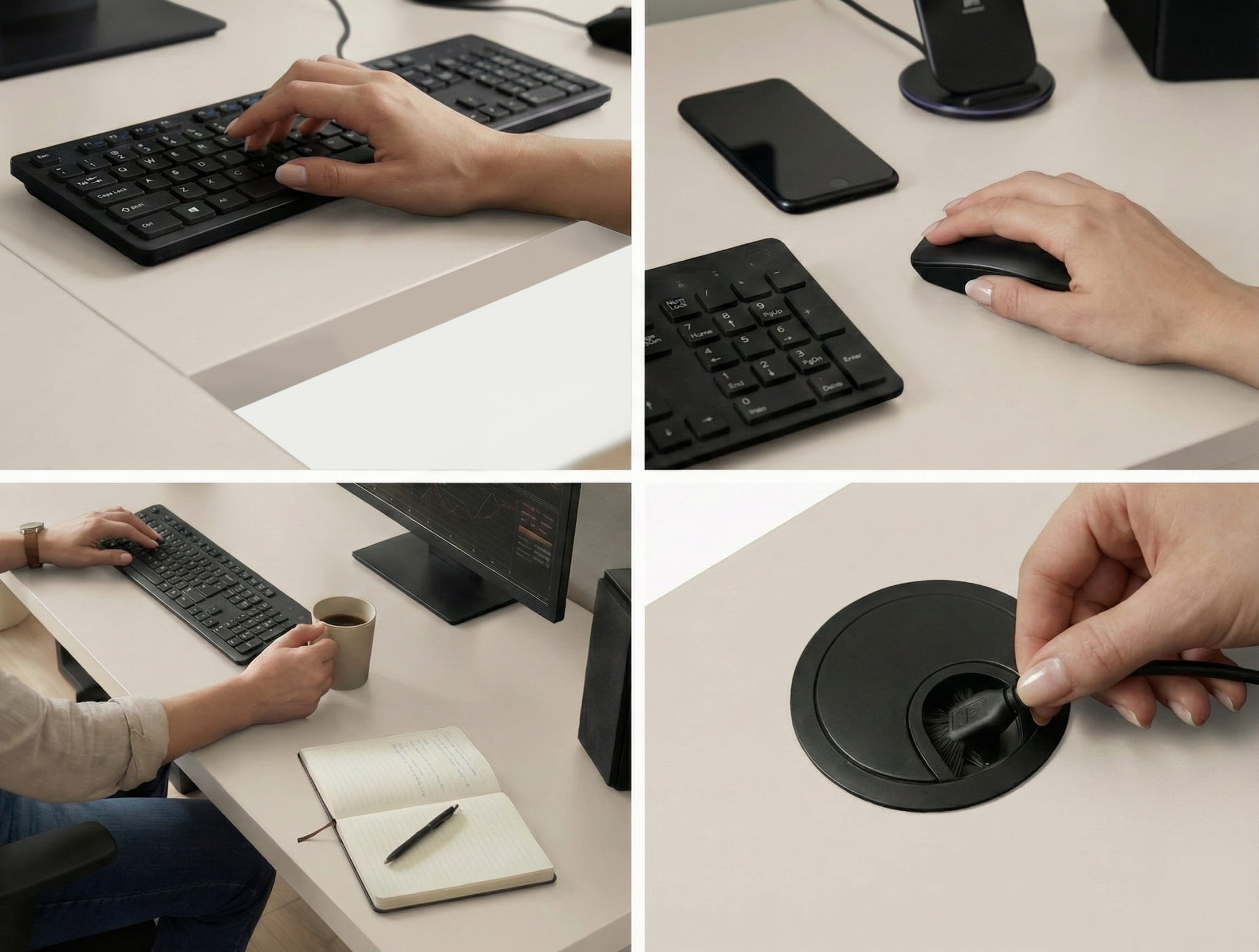 Biurko wyposażone jest w dwa premium metalowe przepusty kablowe ze szczotką – trwałe, eleganckie i znacznie lepsze od tanich plastikowych wersji. Solidny metal podkreśla ekskluzywny charakter biurka, a delikatne włókna nie tylko chronią kable przed kurzem i plątaniem, ale także dodają estetyki. To detale, które wyróżniają biurko i nadają mu nowoczesny, stylowy wygląd.