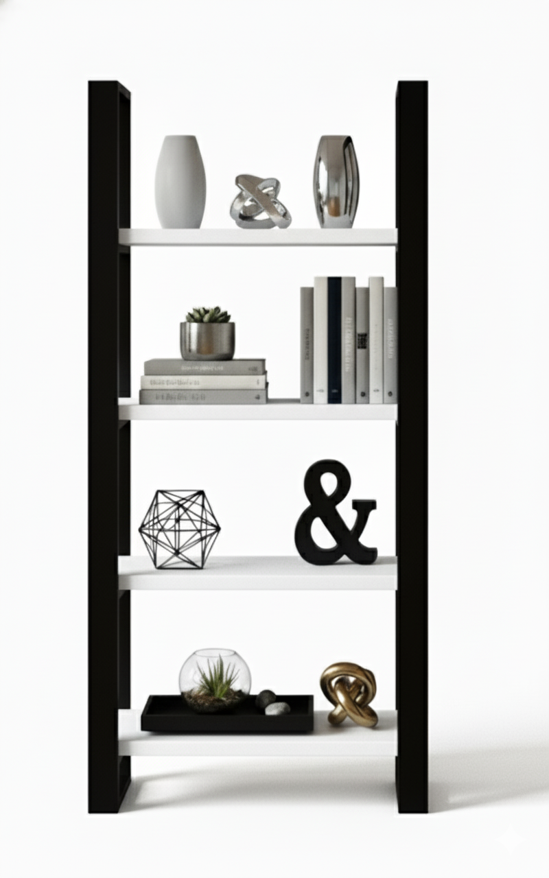 Konstrukcja regału opiera się na solidnym stelażu z profili stalowych malowanych proszkowo na kolor czarny mat, co gwarantuje trwałość i stabilność. Półki wykonane są z wysokiej jakości płyty laminowanej kolorze czarnym.