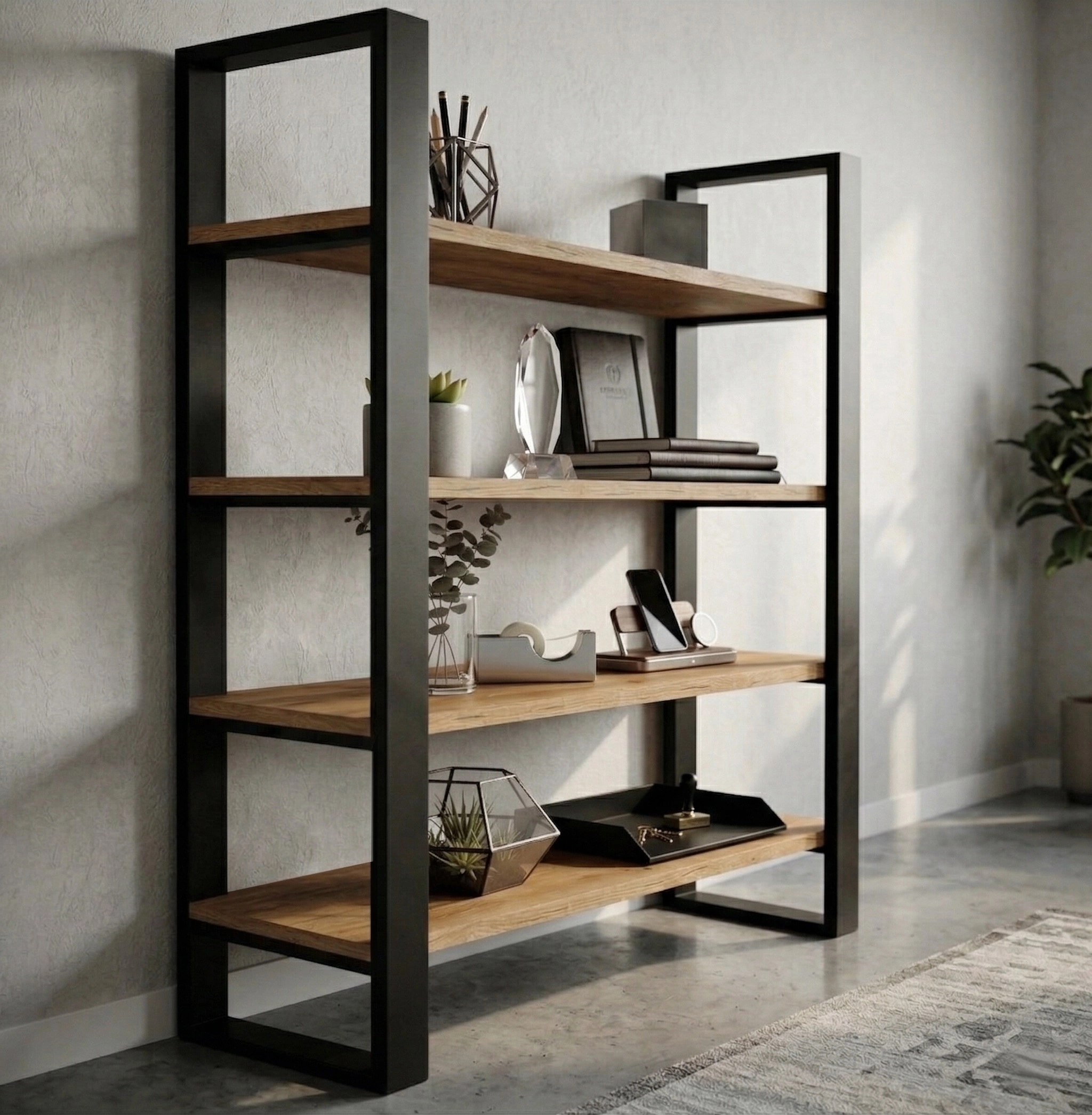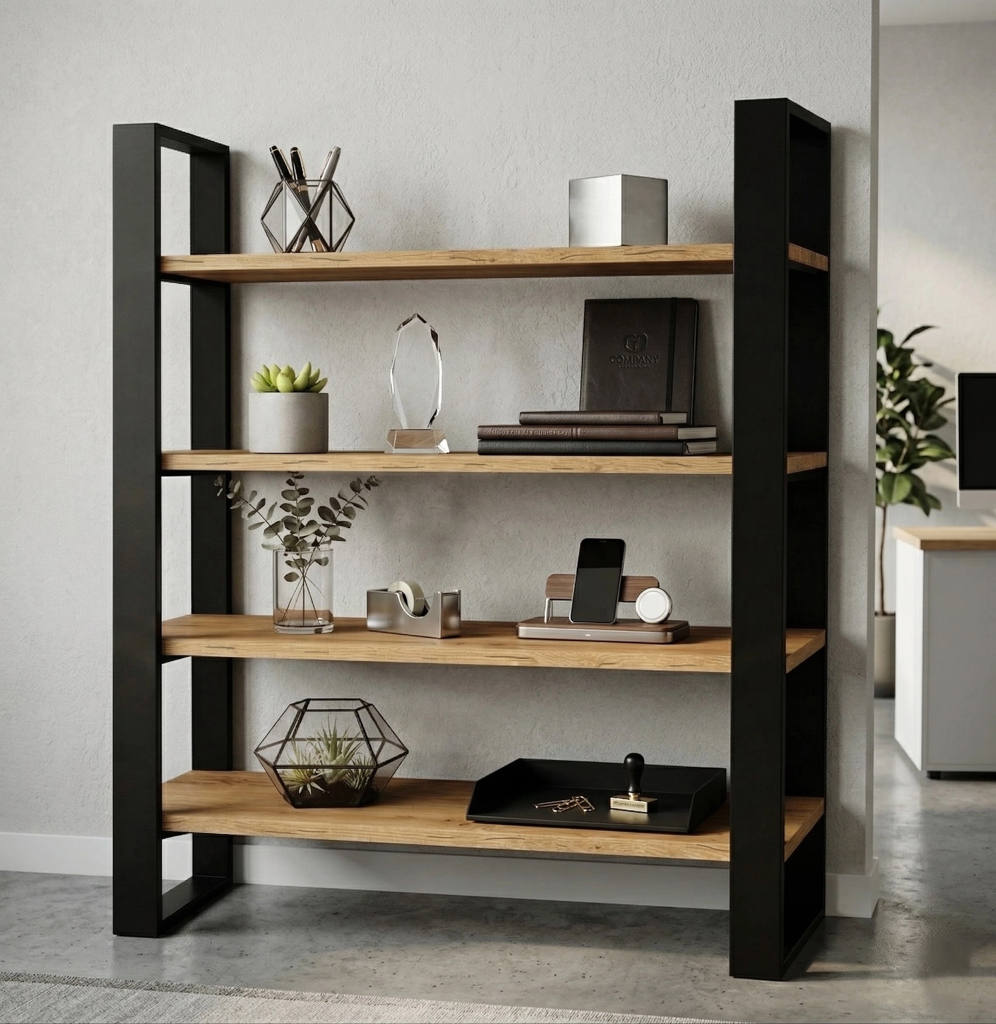Nowoczesny regał loftowy o wysokości 165 cm to idealne połączenie stylu industrialnego z funkcjonalnością. Szerokość 120 cm i cztery przestronne półki o głębokości 38 cm zapewniają mnóstwo miejsca na książki, dekoracje, rośliny czy akcesoria biurowe.