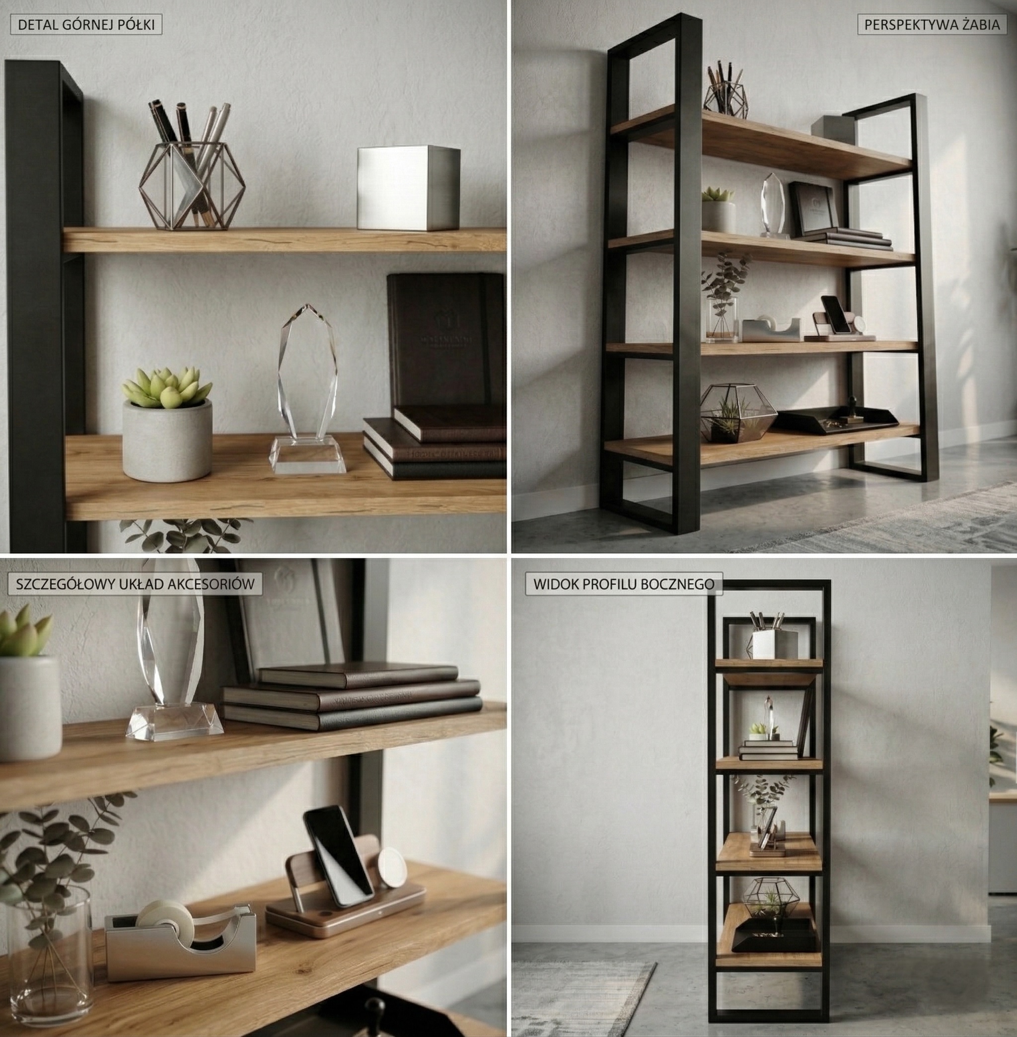 Konstrukcja regału opiera się na solidnym stelażu z profili stalowych malowanych proszkowo na kolor czarny mat, co gwarantuje trwałość i stabilność. Półki wykonane są z wysokiej jakości płyty laminowanej w dekorze dąb craft złoty – ciepłym, naturalnym odcieniu drewna, który doskonale komponuje się z surową stalą.