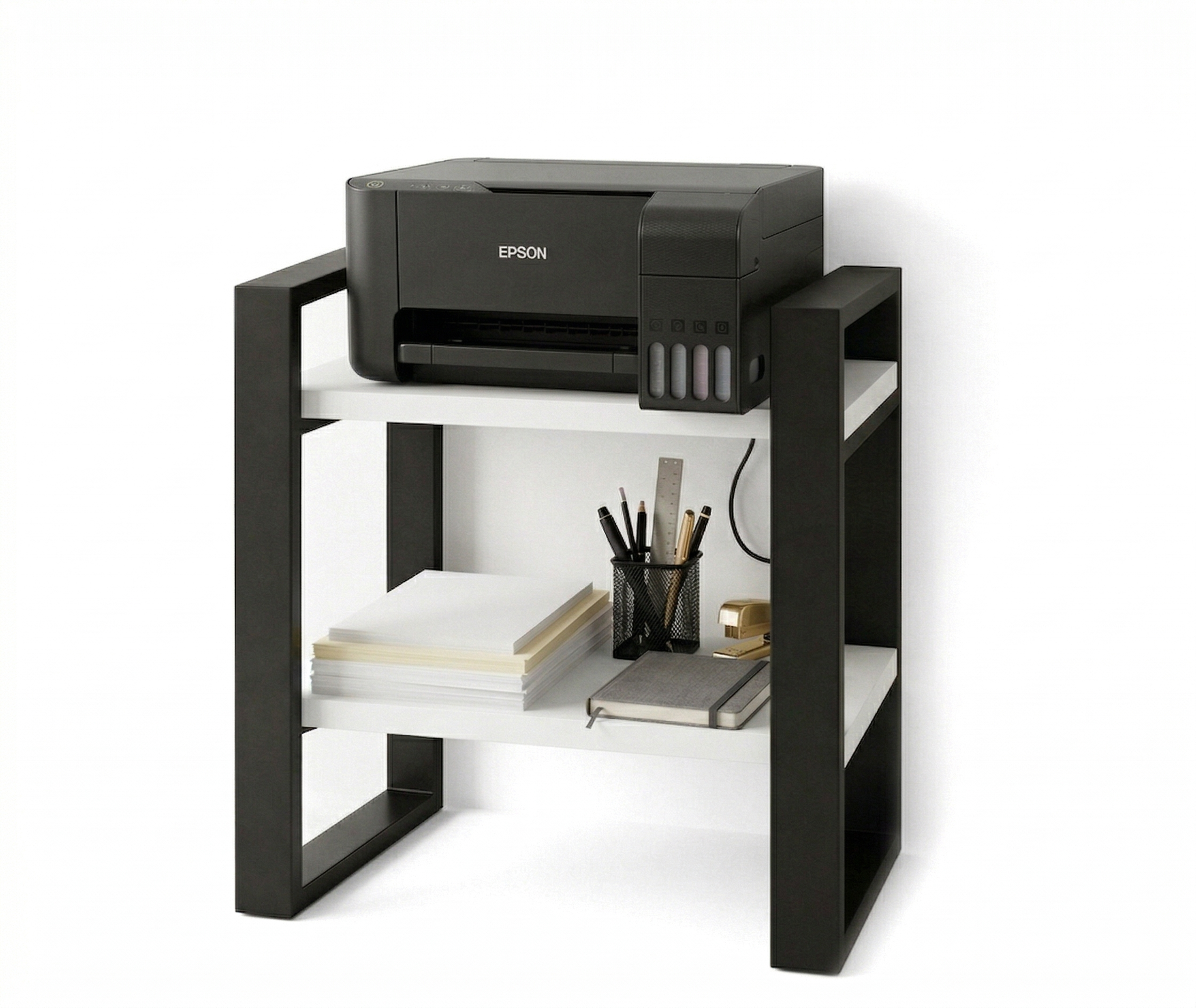 Konstrukcja regału opiera się na solidnym stelażu z profili stalowych malowanych proszkowo na kolor czarny mat, co gwarantuje trwałość i stabilność. Półki wykonane są z wysokiej jakości płyty laminowanej w dekorze Białym
