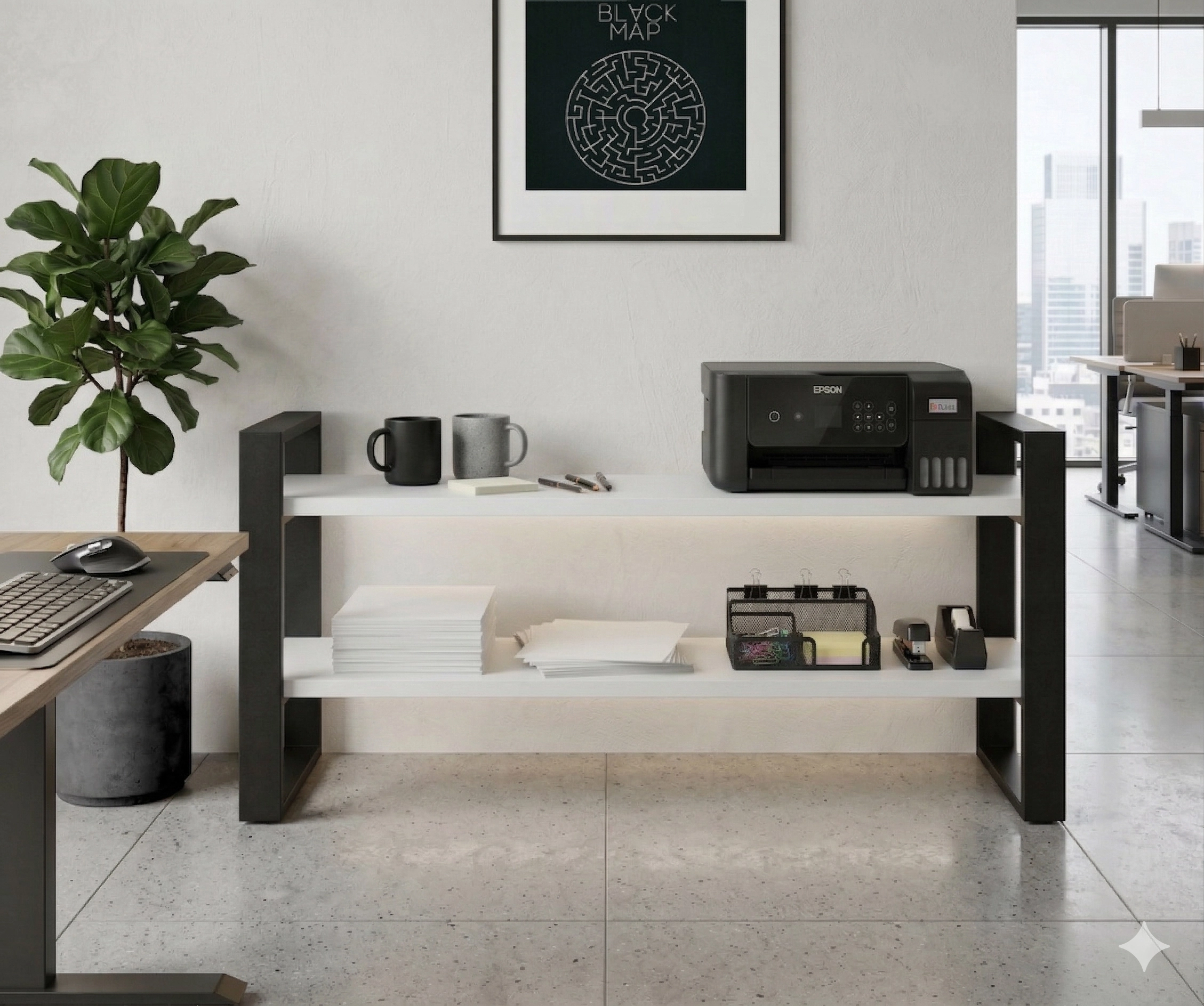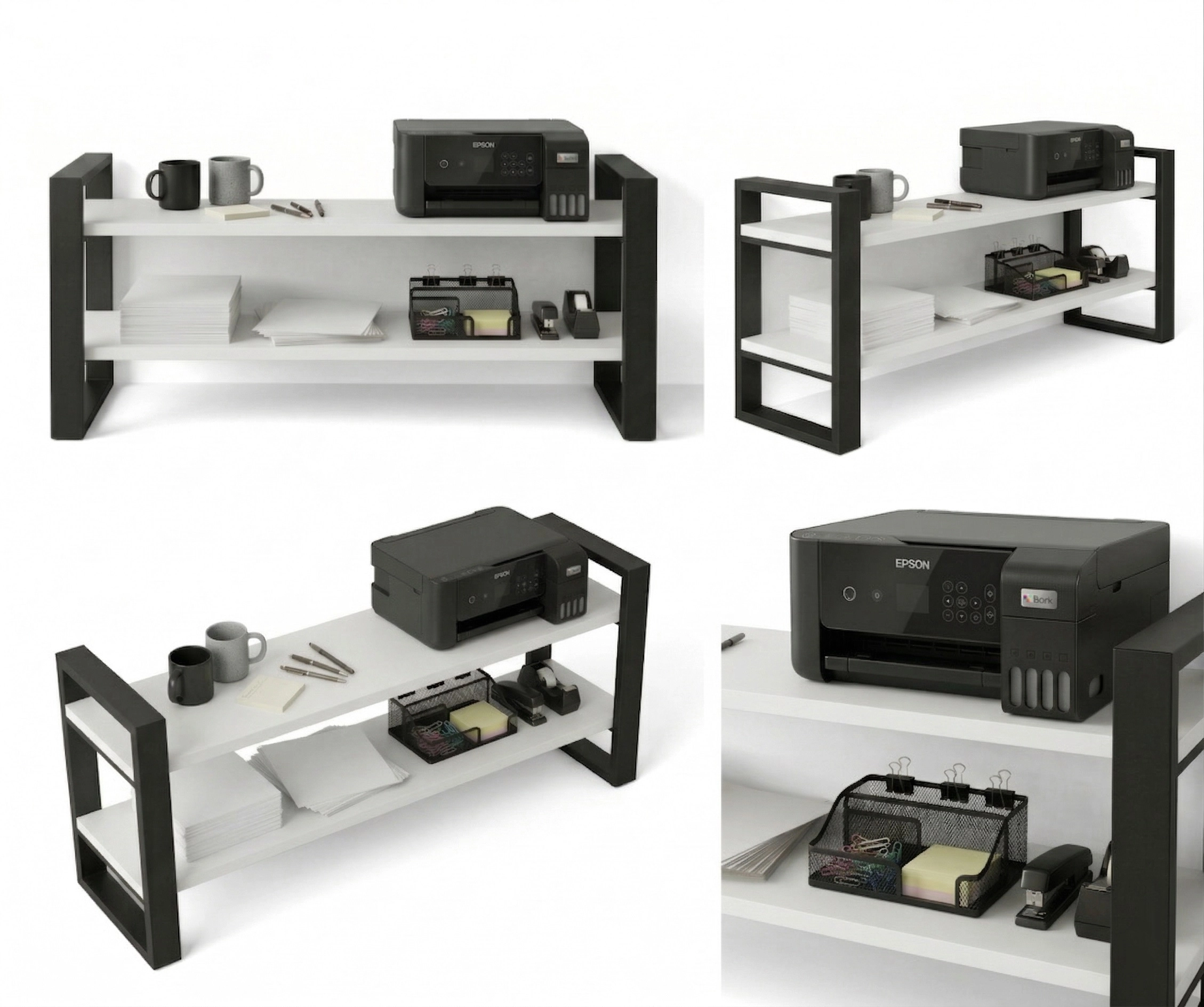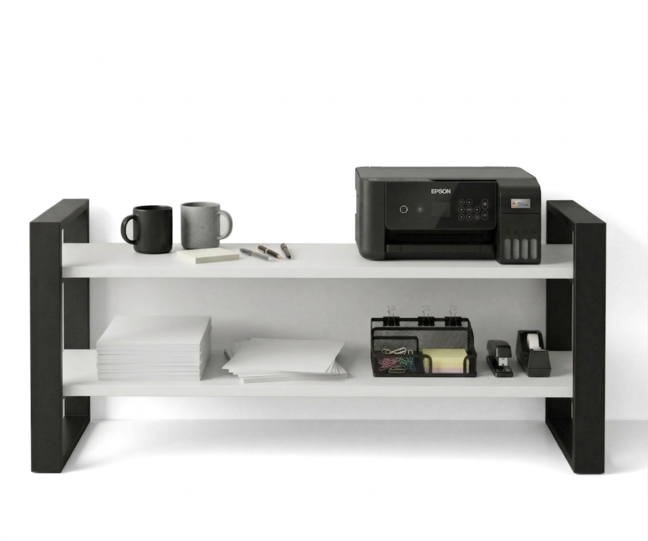 Konstrukcja regału opiera się na solidnym stelażu z profili stalowych malowanych proszkowo na kolor czarny mat, co gwarantuje trwałość i stabilność. Półki wykonane są z wysokiej jakości płyty laminowanej w dekorze Białym