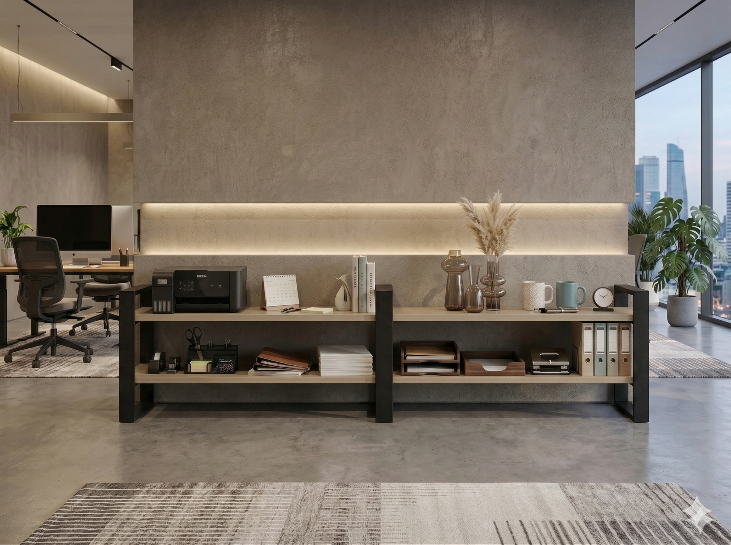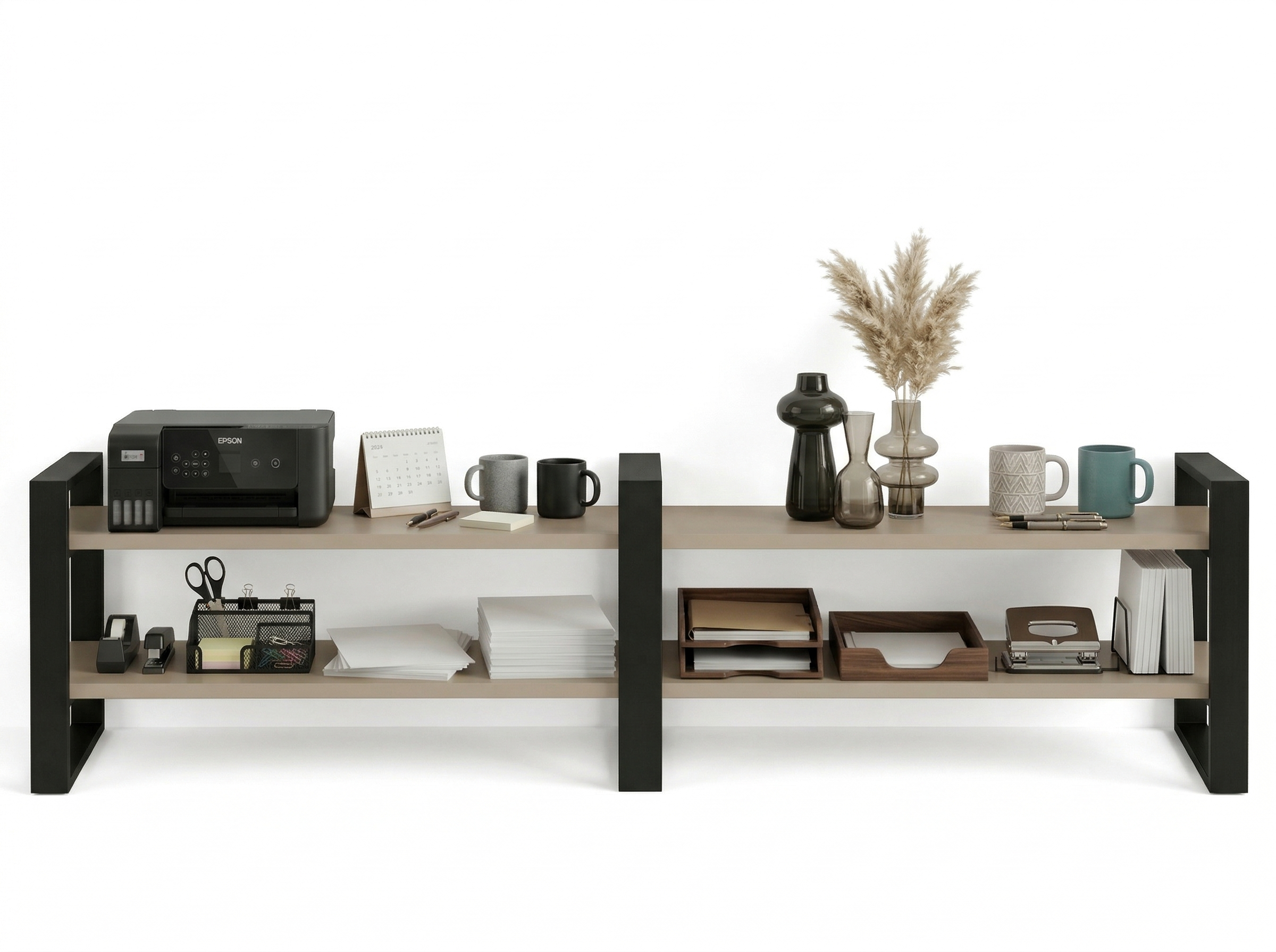 Nowoczesny regał loftowy o wysokości 87 cm to idealne połączenie stylu industrialnego z funkcjonalnością. Szerokość 240 cm i cztery przestronne półki o głębokości 38 cm zapewniają mnóstwo miejsca na książki, dekoracje, rośliny czy akcesoria biurowe.